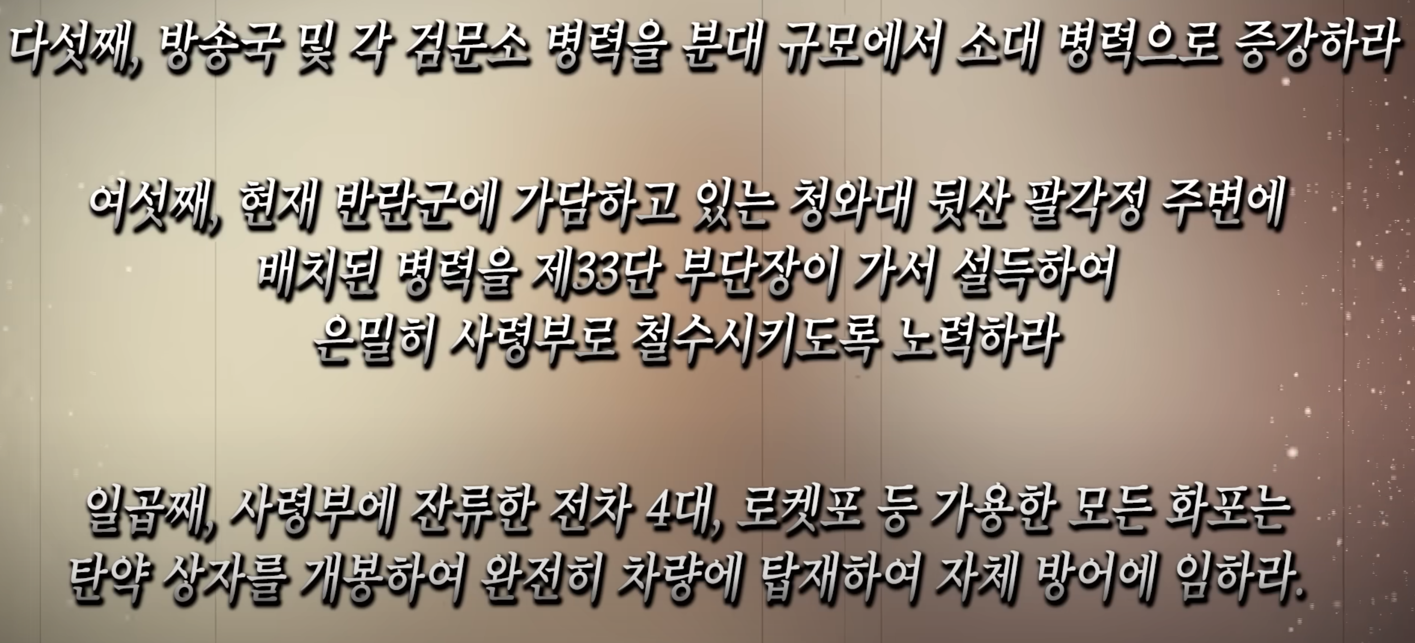 상황이 이렇게 되자 장태완은 수경사에 남은 60명을 대상으로 전두환측에 대한 공격을 준비시키며 다음과 같은 내용을 하달했습니다