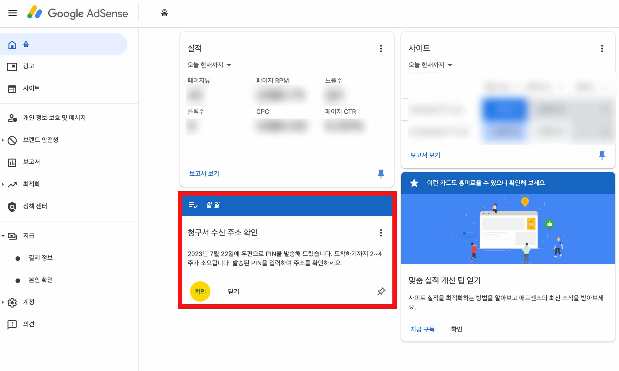 - 애드센스 사이트에서 '청구서 수신 주소 확인' 창 클릭