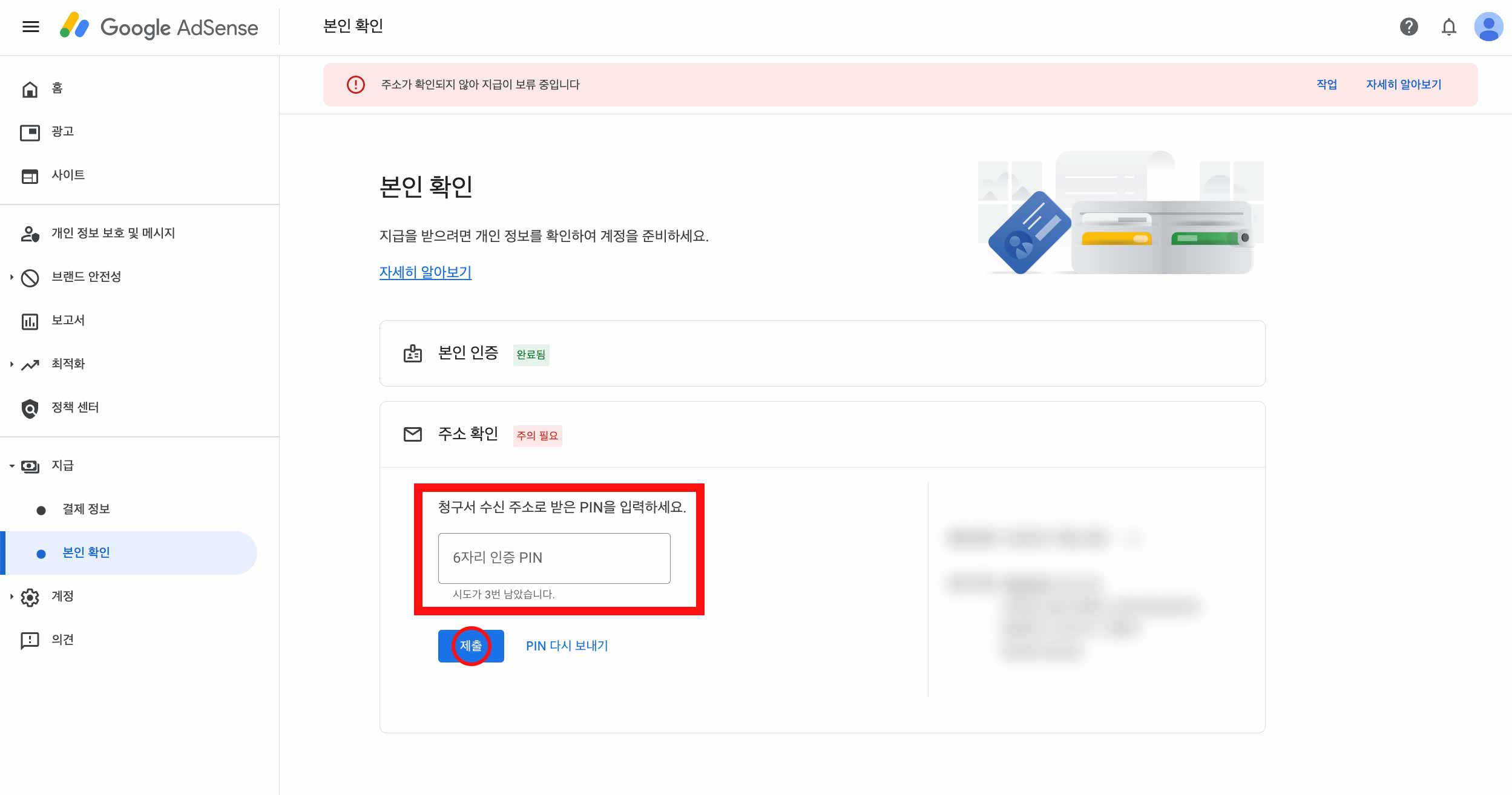 애드센스 계정에 로그인을하고 지급 > 본인확인을 클릭합니다 그 후 수령하신 우편물에 적힌 6자리 애드센스 핀번호를 입력 후 제출합니다
