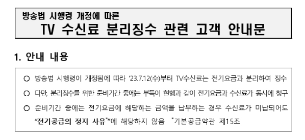 종이 · 이메일 · 모바일 청구서를 받아 직접 계좌 이체를 하는 고객은 따로 분리징수를 신청할 필요가 없습니다. 앞으로 전기요금이 청구되면 TV수신료인 2500원을 빼고 전기요금만 납부해도 됩니다.
