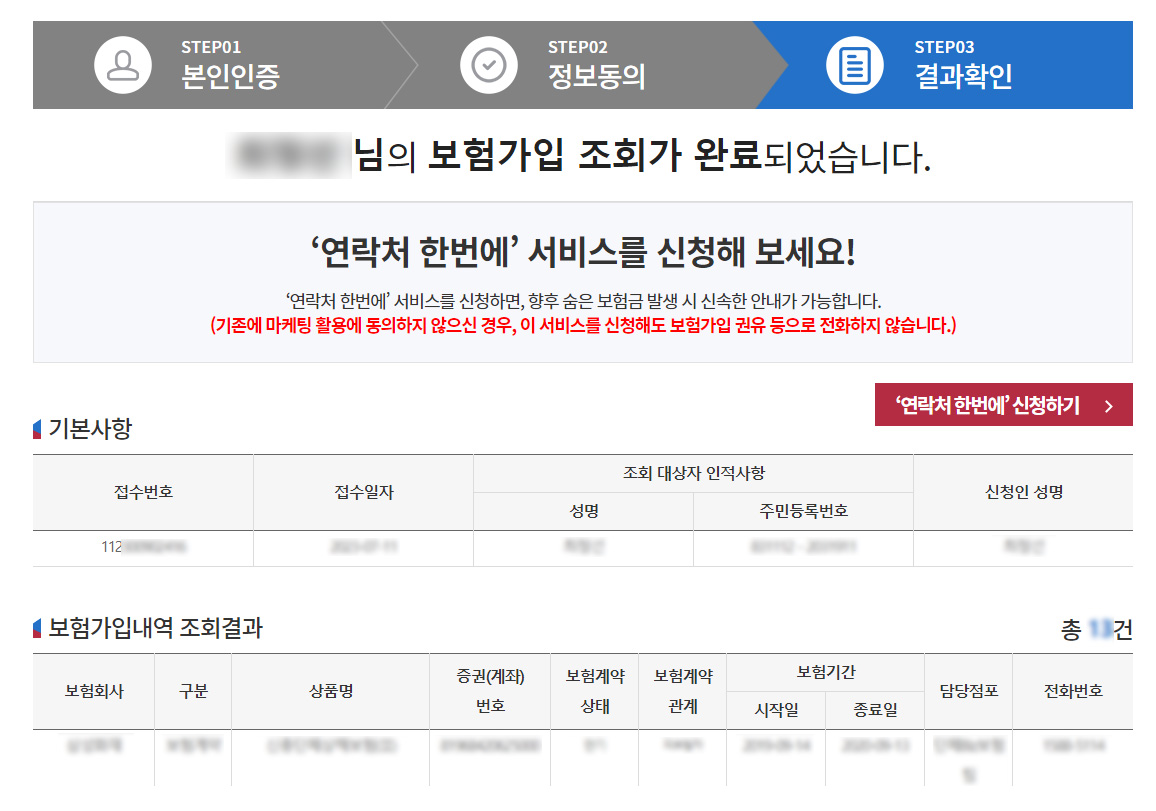 조회가 완료되면 가입한 보험내용을 확인할 수 있으며 결과확인은 1개월간 가능합니다.