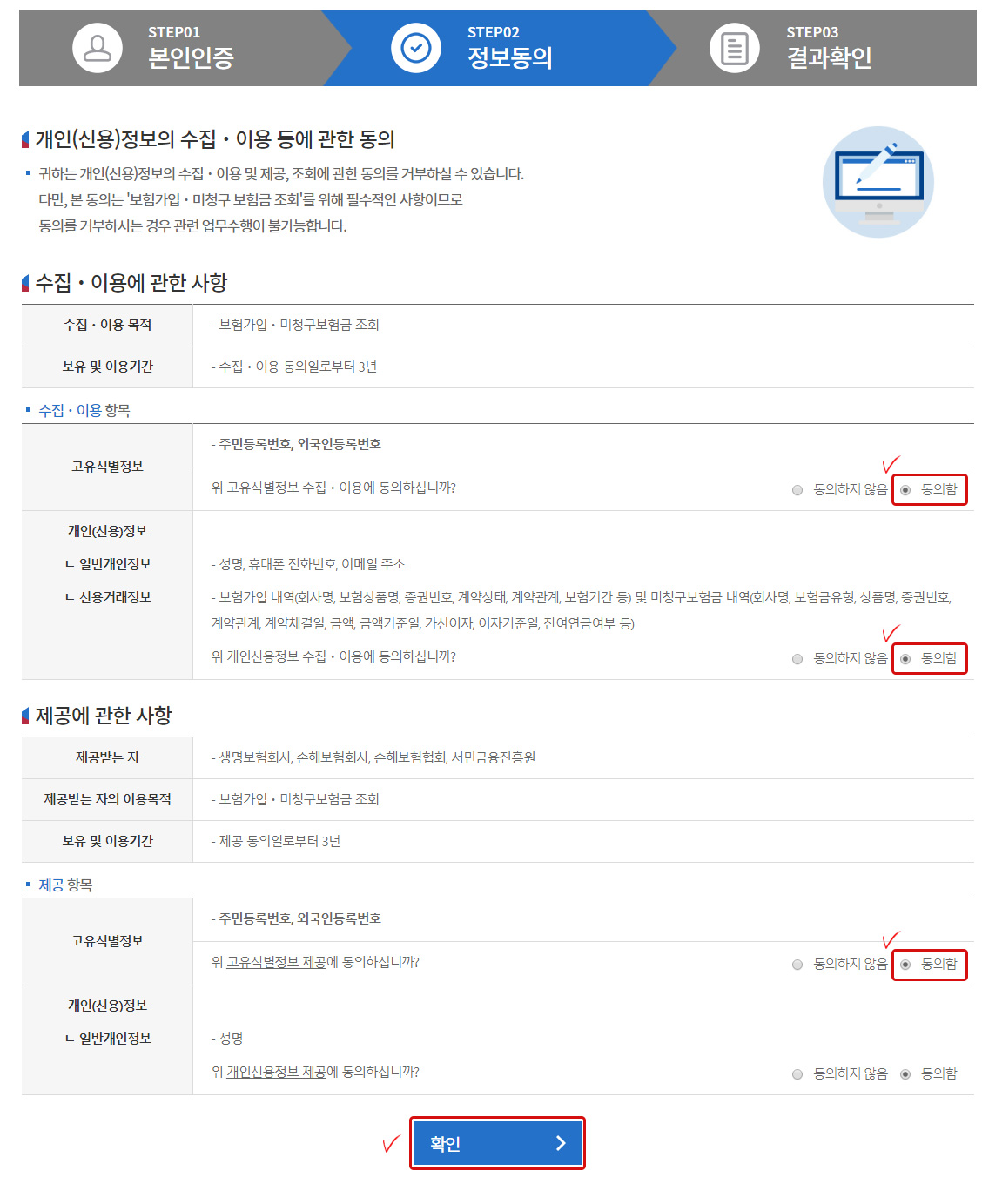 정보활용에 대한 내용을 확인 후 동의에 체크, 하단에 '확인'버튼을 클릭합니다.