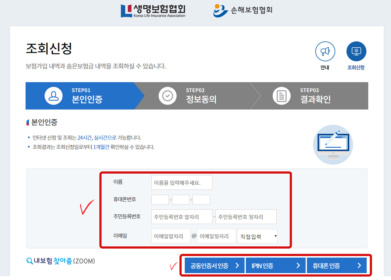 '내보험찾아줌' 웹사이트를 통하여 공유일 및 주말 상관없이 24시간 이용할 수 있는 무료 서비스로 회원가입의 번거로움 없이 정보입력 및 공동인증서나 IPIN, 휴대폰인증을 통해 숨은보험금을 확인하실 수 있습니다.